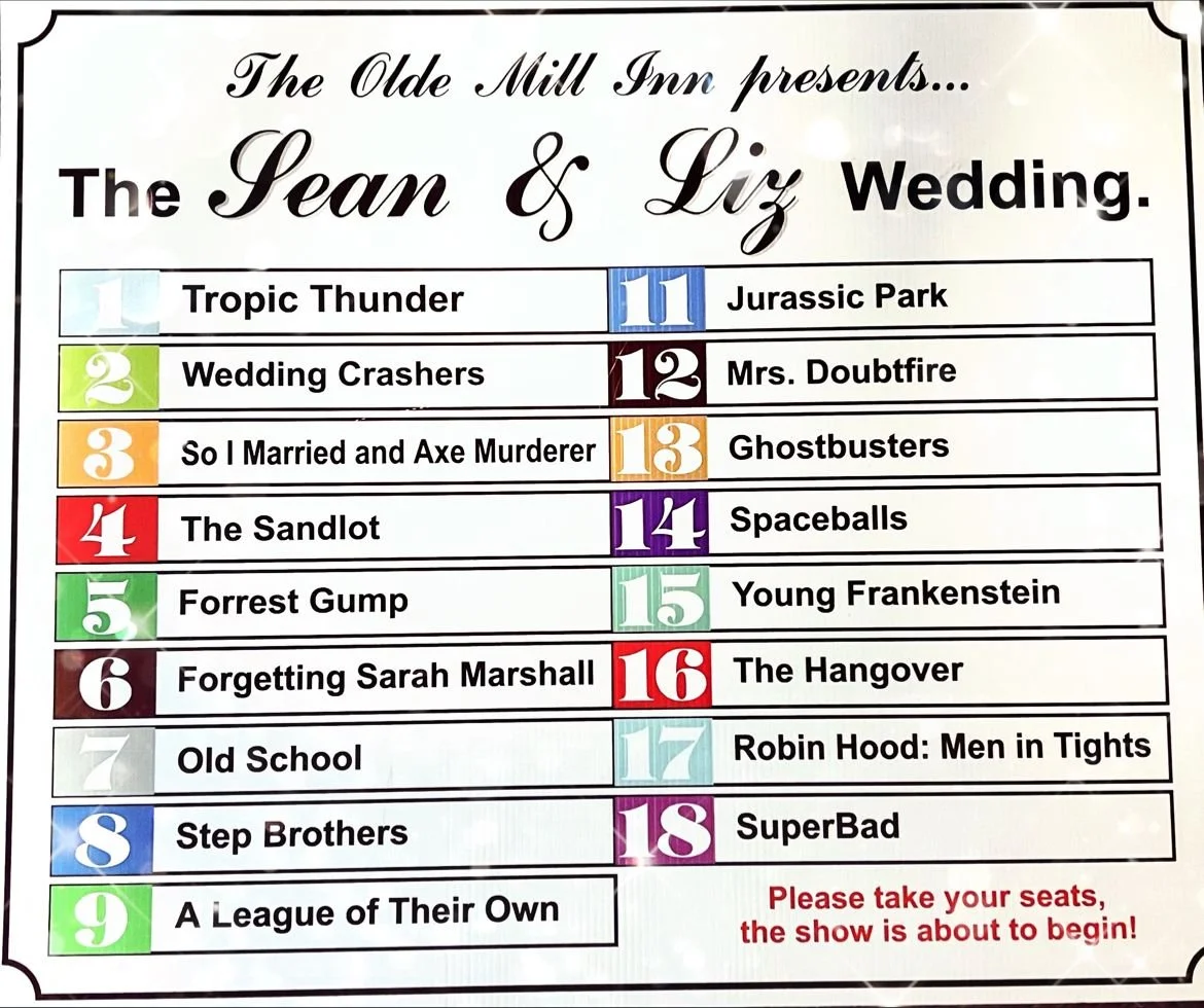 The arrangement: Each table was named after one of our favorite movies. Every person at that table was specifically seated at the movie table they would identify with l. For instance, all my childhood friends & I loved the movie Wedding Crashers growing up. After that movie came out I don’t think anyone could say the word “motorboat” without someone quickly spitting out the famous line. 😂 They got that table. Smash hit!